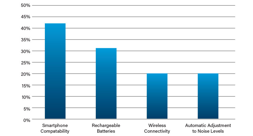 In a Consumer Reports survey, the most important feature cited among patients who wear hearing aids when they purchased their current model was smartphone compatibility—the ability to adjust hearing aids from a smartphone. Other important features included rechargeable batteries, wireless connectivity to other devices (such as a music player or TV), and automatic adjustments to a room’s noise level (Table 2).6