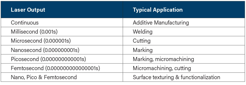 The laser provides non-contact, optical energy focused onto the workpiece. A wide variety of lasers are now available that align with individual process requirements—whether creating a melt pool, minimizing heat effect, or optimizing material removal. Many lasers are operated in pulsed mode for precise control of power/energy/heat input. The length of the pulse relates to the process, with the Table listing the commonly associated applications.