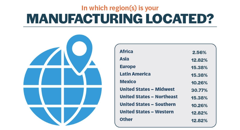 When polled about the most popular locations for companies’ manufacturing suppliers, most indicated the United States, with over half located in the Midwest. Mexico, Europe, and Asia were also popular choices of regions where their manufacturing suppliers are located.